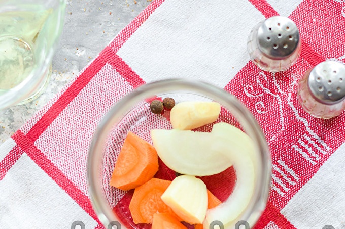 На дъното на буркана хвърлете нарязани моркови, няколко половинки пръстена лук и черен пипер. Към буркана добавете и обелена чеснова скилидка.