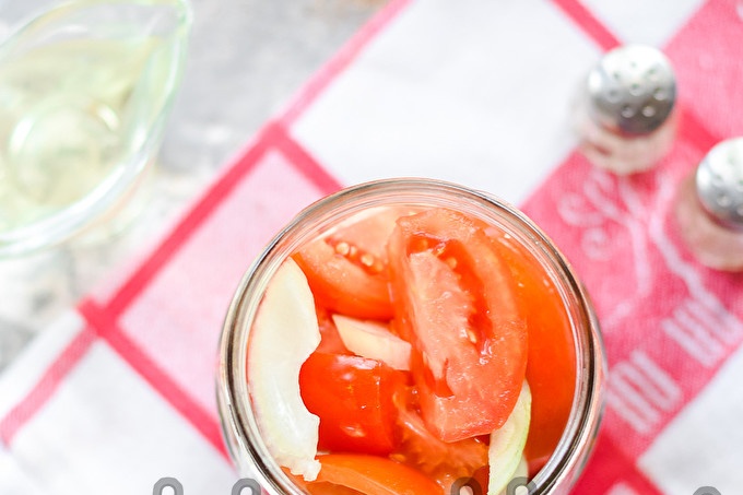 Напълнете буркана последователно със слоеве - домати, лук и т.н. В процеса разклатете буркана няколко пъти, така че доматите да лежат по-плътно един до друг.