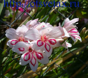 - Розово-бяла ацидантера - има бели цветни венчелистчета със светъл нюанс на малинов цвят. Най-често този сорт се използва за кръстосване с други сортове.