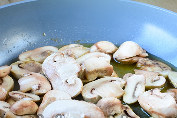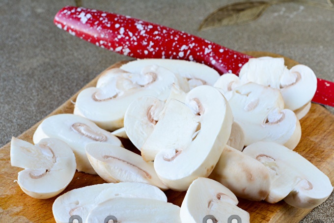 Измийте шампиньоните и ги поставете върху салфетки, за да поемат излишната влага. Готовите гъби, нарязани на чинии, заедно с краката. В процеса на печене шампиньоните все още ще намаляват по обем, така че няма смисъл от финото нарязване.
