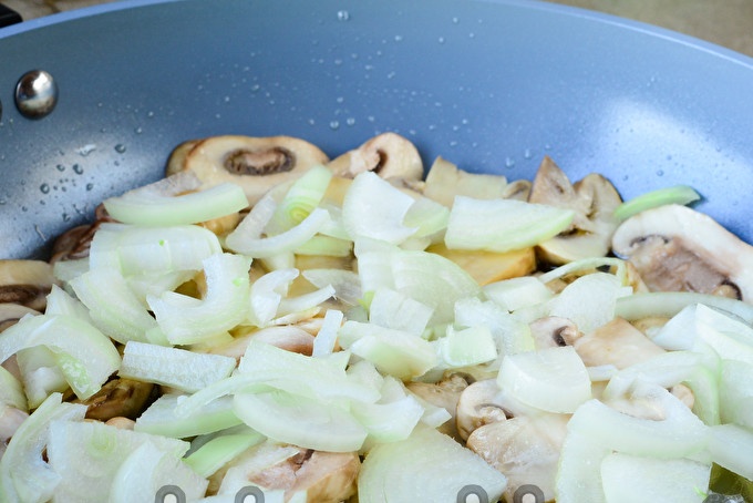 След 4-5 минути добавете лука в тигана. Започнете да пържите всички заедно, като добавите сол и черен пипер на вкус.