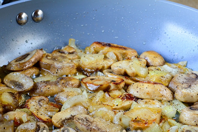 Обелете крушката, изплакнете и нарежете една четвърт с пръстени. Такъв лук равномерно ще се пържи заедно с гъбите и няма да остане суров.