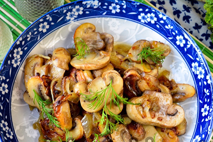 Шампиньоните са сочни, ароматни и вкусни. Допълнете ги с прясно нарязан копър. Приятен апетит!