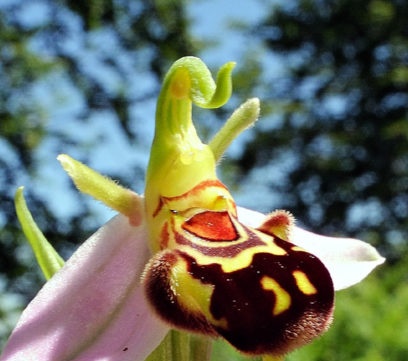 Този сорт се различава от другите хибриди по структурата на цветето. Устната наподобява причудлива усмихната пчела. На цветен клон с височина 40 см. Расте едно-единствено цвете с три листенца малина и шарена вътрешна част с пухкаво покритие.
