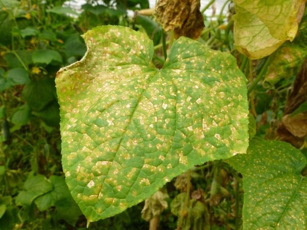 Появата на жълти петна по листата на краставиците причинява паразити, Следните признаци показват инфекция: