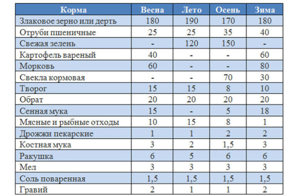 През лятото: моркови, тиква, мляко. През зимата: силоз с боб, боб или препарат с витамин А |