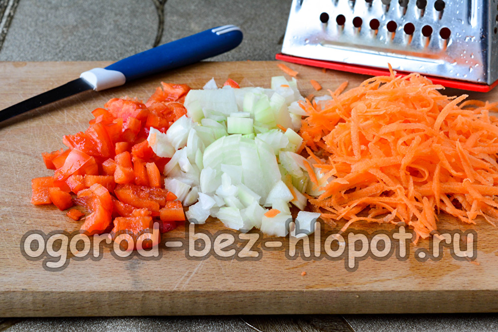 Смиламе останалите зеленчуци: три моркови на ренде, лук и чушки с малки кубчета.