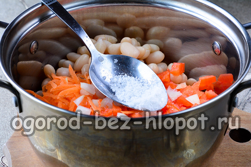 Смесете в тиган всички съставки: боб, моркови, лук и сладки чушки. Салата и добавете малко гранулирана захар. Слагаме сол или 1 пълен десерт, или супена лъжица без пързалка. Смесете салатата.