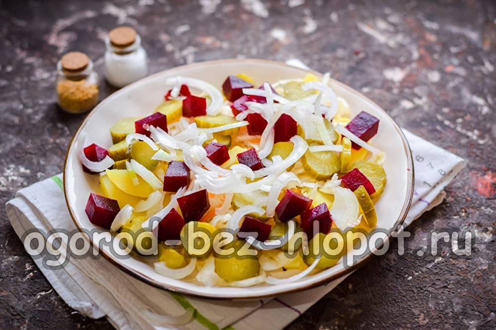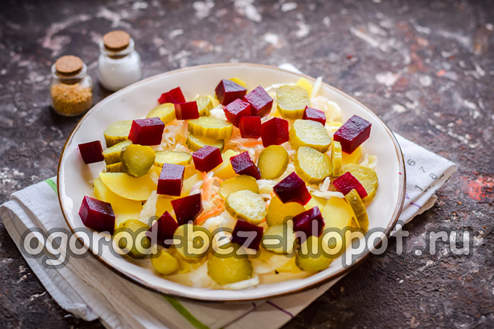 Сварете цвеклото предварително, докато омекне, след това охладете, обелете, нарежете на кубчета. Разстелете цвекло върху всички съставки.