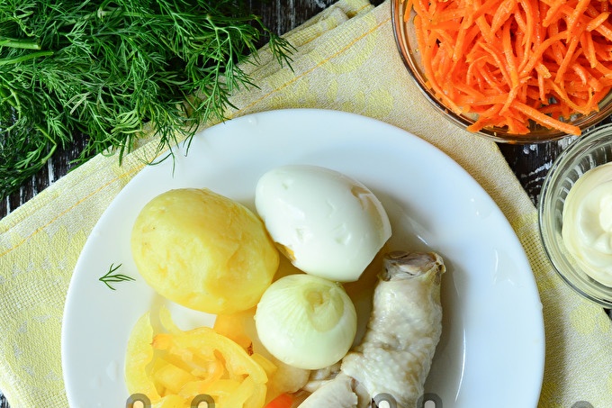 За да направите салата, ще ви трябват пилешки клечки или половин гърда. Предварително изпечете месото във фурната или сварете. Сварете яйцата и картофите, докато се сварят. По желание лукът се маринова в разтвор от вода и оцет. Когато избирате майонеза, дайте предпочитание на предложенията на познати производители, но не забравяйте да проверите датата на годност и да проучите състава. Ако не сте намерили натурален сос, направете домашна майонеза - изобщо не е трудно, но ще бъдете абсолютно сигурни в качеството му.