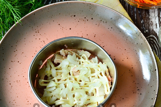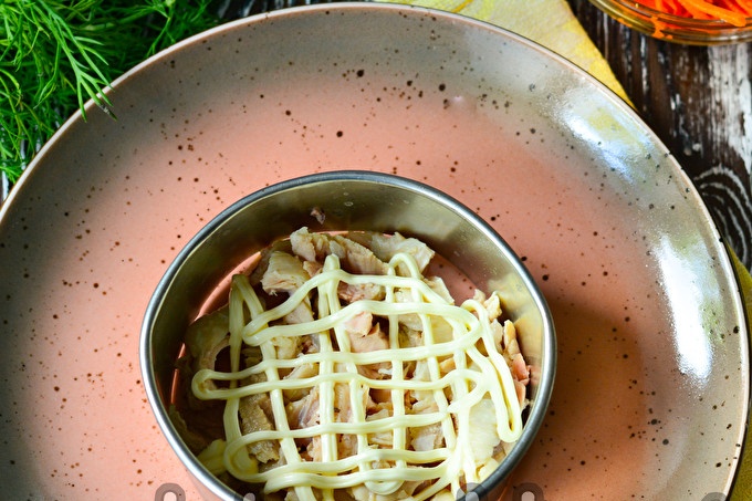Пилешка клечка нарязана на малки парченца. Поставете на дъното на подготвената форма или върху чиния с пръстен за красив стайлинг. Направете малка дупка в тубата за майонеза и нанесете лек слой.
