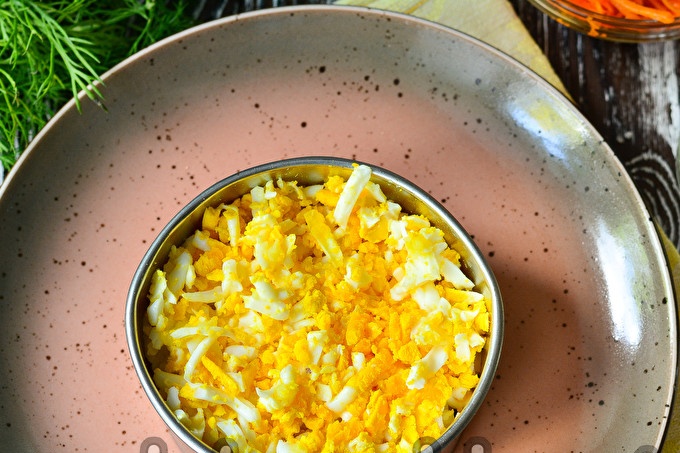 Изстискайте острите моркови от маринатата и сложете на равен слой. Отгоре изсипете обилна майонеза.