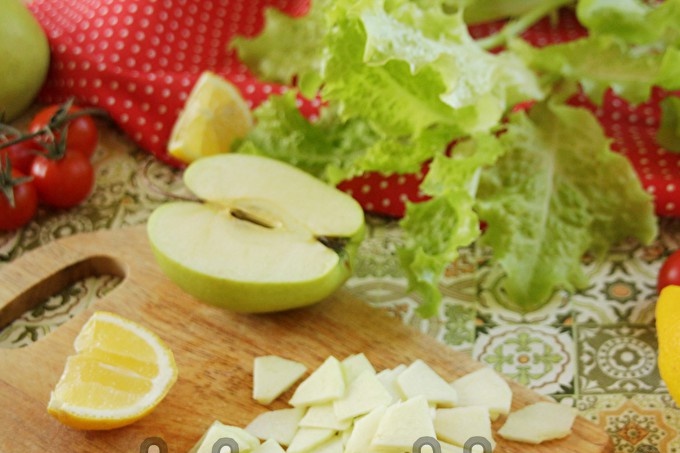 Измиваме ябълката, обелваме я и я нарязваме наполовина. Извадете сърцевината със семена. Нарежете ябълката на тънки малки филийки, прехвърлете в купа и, поръсена с лимонов сок, разбъркайте, така че сокът да се разпространи по всички филийки. В този случай ябълките няма да потъмняват в бъдеще, което ще направи салатата по-апетитна.