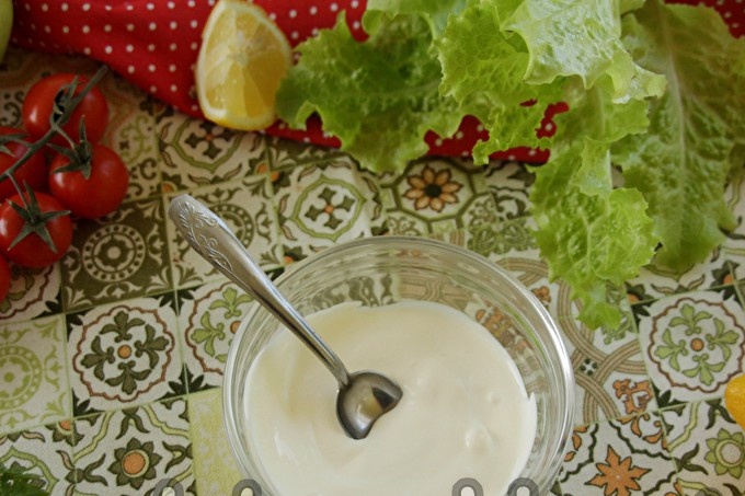 Най-добре за тази салата, като дресинг е подходящо натурално кисело мляко без пълнеж. Можете да използвате домашна майонеза или смес от майонеза и заквасена сметана (1: 1), но в тези случаи салатата ще бъде по-висококалорична.