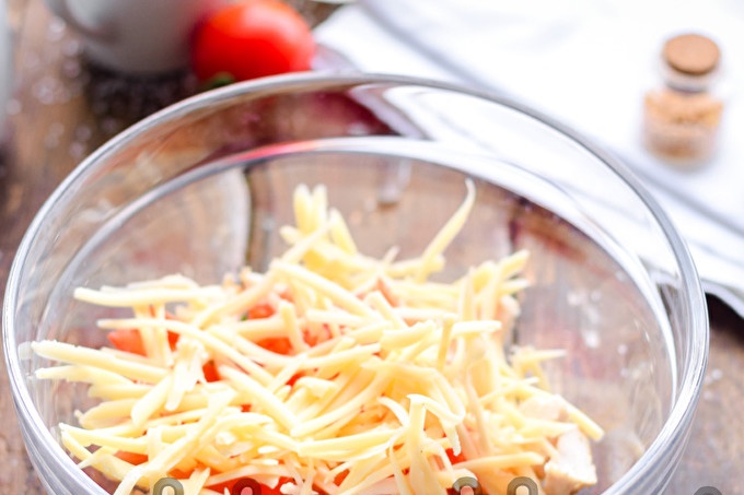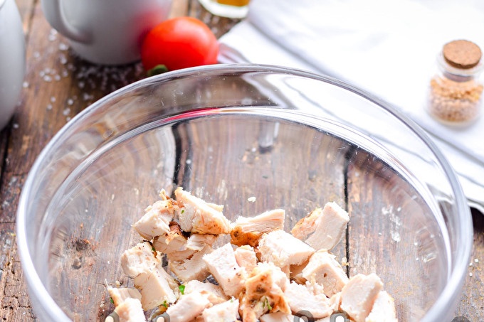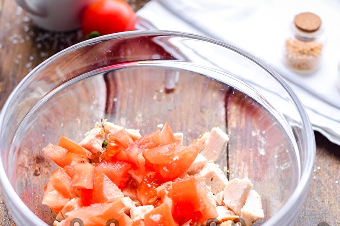 След това изплакнете голям зрял домат. Нарежете го на малки кубчета и добавете към пилешкото месо.