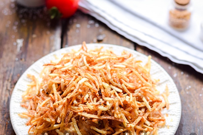 Вземете плоска малка чиния, сложете салатата на слайд и я покрийте с картофени сламки. Поднесете тази салата веднага на масата, докато картофите са хрупкави.