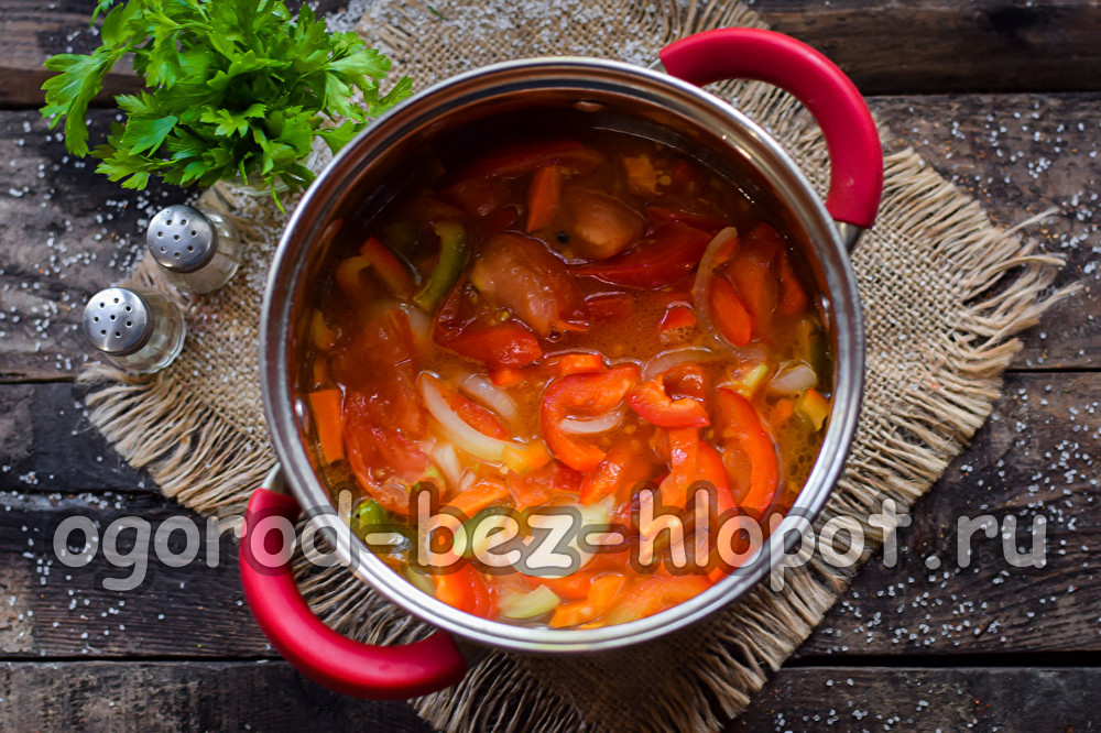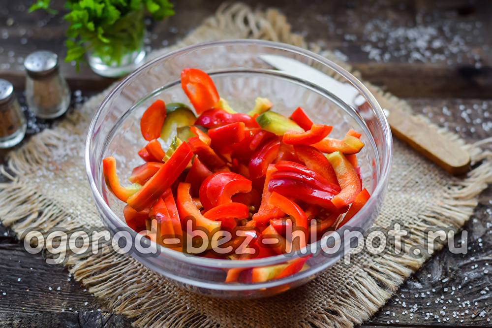За изчистване на сладък пипер от семена и премахване на всички дялове. Нарежете чушката на ивици. По-добре е да изберете пипер с дебелостенни, месести, зрели. Добавете нарязаните чушки към доматите.