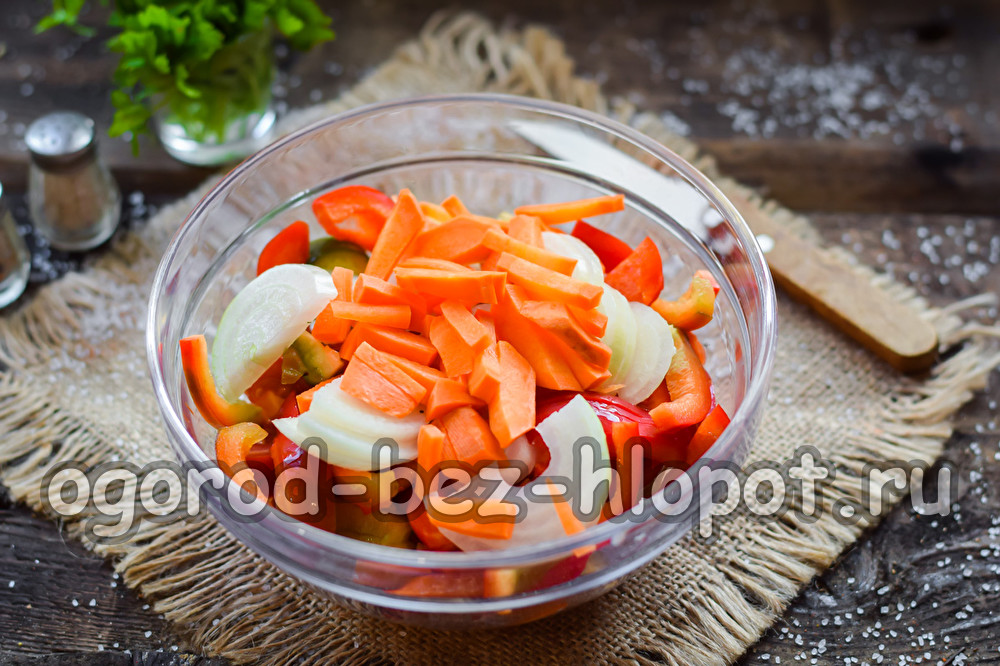 Обелете и измийте морковите, нарязани на ивици или кубчета. Добавете морковите в купа с всички зеленчуци.