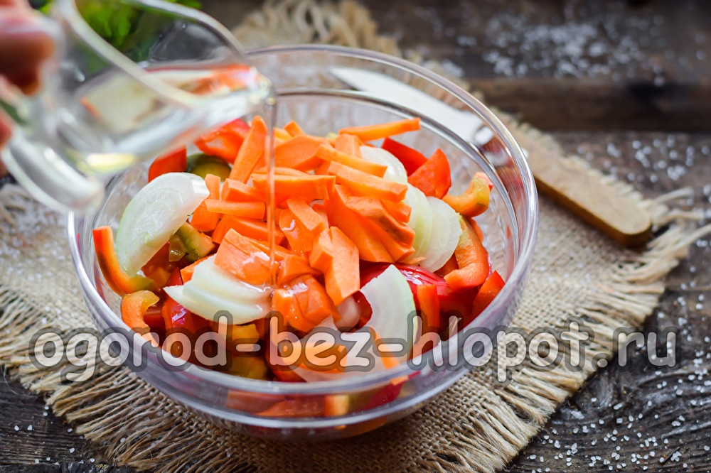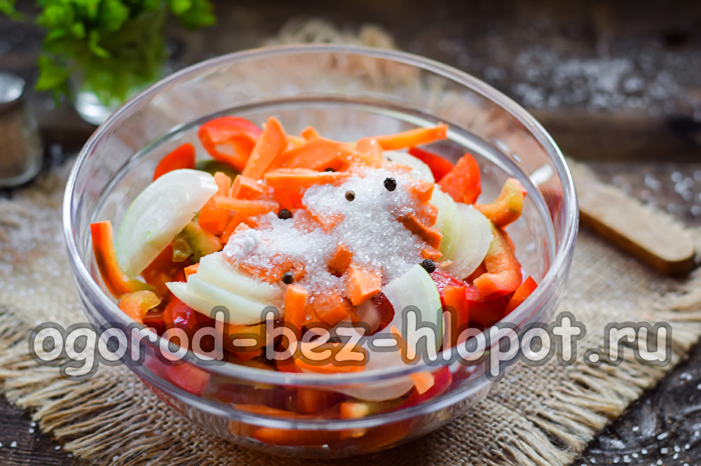 Изсипете сол и захар в салатата, добавете чушките черен пипер. Прехвърлете всички съставки в тава и изпратете на огъня.