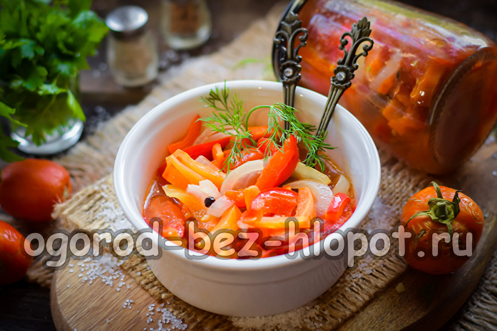 Предлагам ви най-вкусната салата, която е лесна за приготвяне, - салата Paramonikha за зимата. Рецептата със снимката ще ви помогне да повторите процеса точно, надявам се да ви хареса. Салата се състои от прости летни зеленчуци - домати, чушки, лук и моркови. Всички зеленчуци, които просто трябва да нарежете и сварете за 15 минути - това е всичко, марулята все още не е измислена. Така че, ако сте начинаещ и никога не сте навивали буркани за салати за в бъдеще, ще успеете в този вариант.