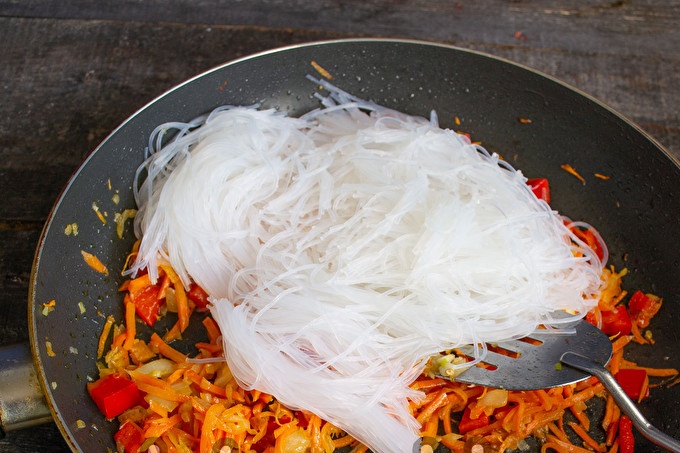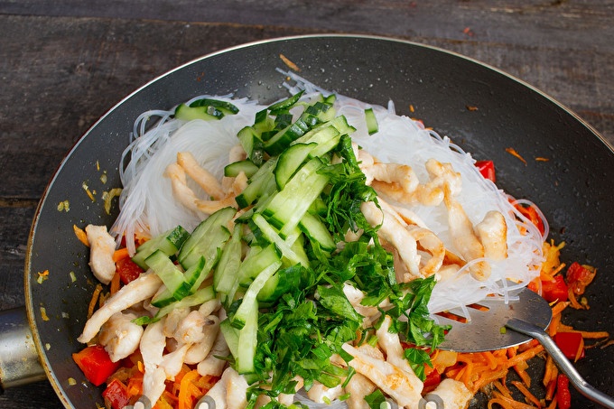 Сложете фуншока в тиган за зеленчуци.