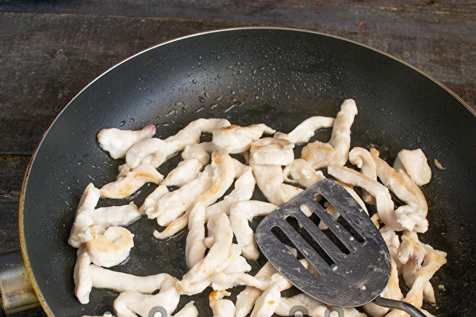 Добавете пърженото пилешко филе.