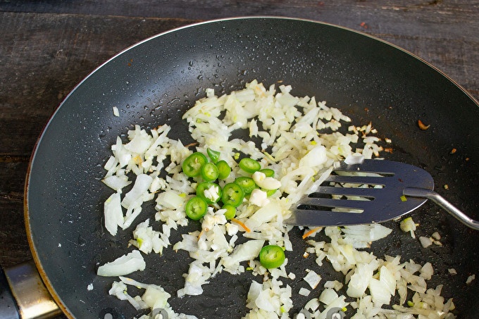 В същия тиган слагаме лука, нарязан на кубчета, пасираме лука за 5 минути, добавяме чесъна, преминаващ през пресата за чесън, и фино нарязаните люти чушки.