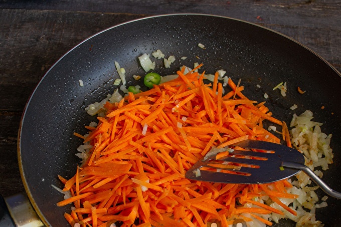 Настържете морковите с тънки ивици. Когато лукът стане почти прозрачен, добавете към него морков, запържете 5-7 минути.