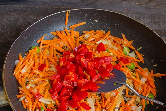 Към морковите и лука добавяме нарязана шушулка от месест червен пипер, добавяме заедно сол или соев сос, прясно смлян черен пипер, готвим 5 минути.