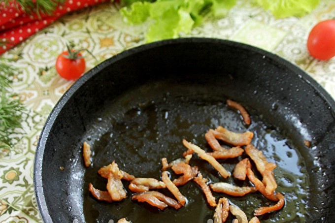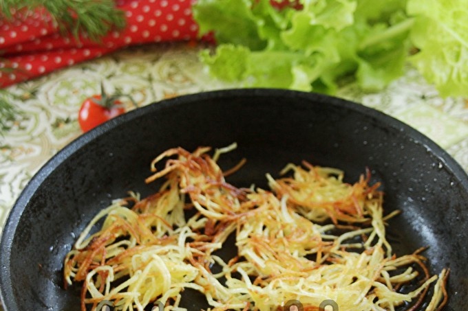 Сложете картофите в купа и напълнете със студена вода. След 5-7 минути заменете водата с прясна вода. Правим това 2-3 пъти, докато водата с картофи остане бистра. Запържете картофите в добре загрят тиган с растително масло (2 супени лъжици), докато се сварят.