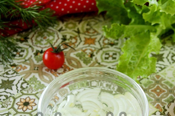 Обелете лука от обвивката, нарежете на тънки полукръгчета и залейте с вряла вода - за да не се горчи. Хвърлете лука върху сито.