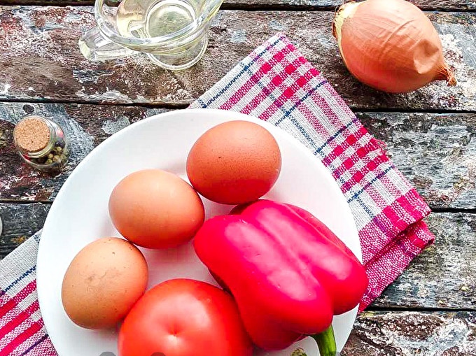 Ще подготвим всички необходими съставки. Измийте добре домата и пипера под течаща вода и подсушете. Взимаме лук със среден размер, обелваме го, измиваме го под вода и го нарязваме на ситно.