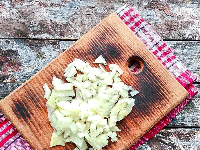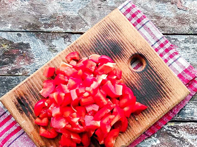 Нарежете пипера на половина, извадете средата, изплакнете отново и нарежете на малки парченца.