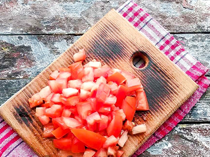 Нарежете домата на малки кубчета.