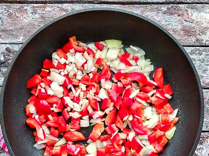 Взимаме тигана, наливаме растителното масло и го изпращаме да загрее. Слагаме лука и черния пипер в добре загрят тиган. Запържете зеленчуците за 4-5 минути.