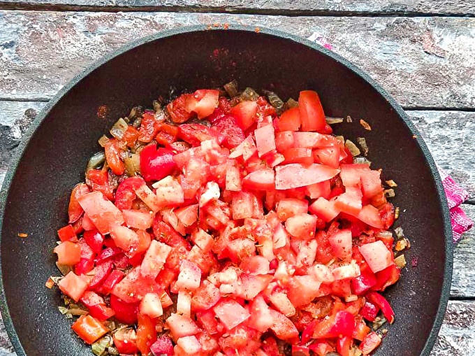 Добавете нарязания домат, солта, подправките към черния пипер и лука, разбъркайте добре и запържете още 2-3 минути.