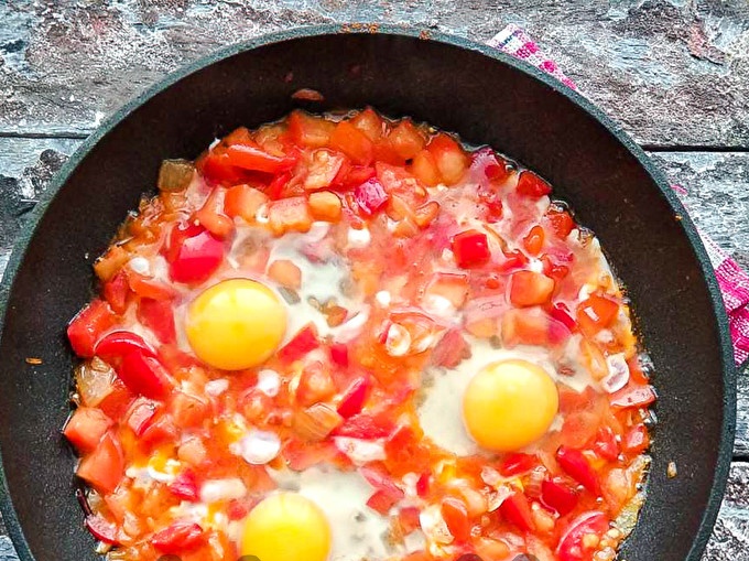 Шакшука е много вкусна опция за закуска, която традиционно се приготвя в Израел. В нашата кухня такова ястие се нарича бъркани яйца с домати. Състои се от яйца, които се задушават в ароматен доматен и зеленчуков сос.
