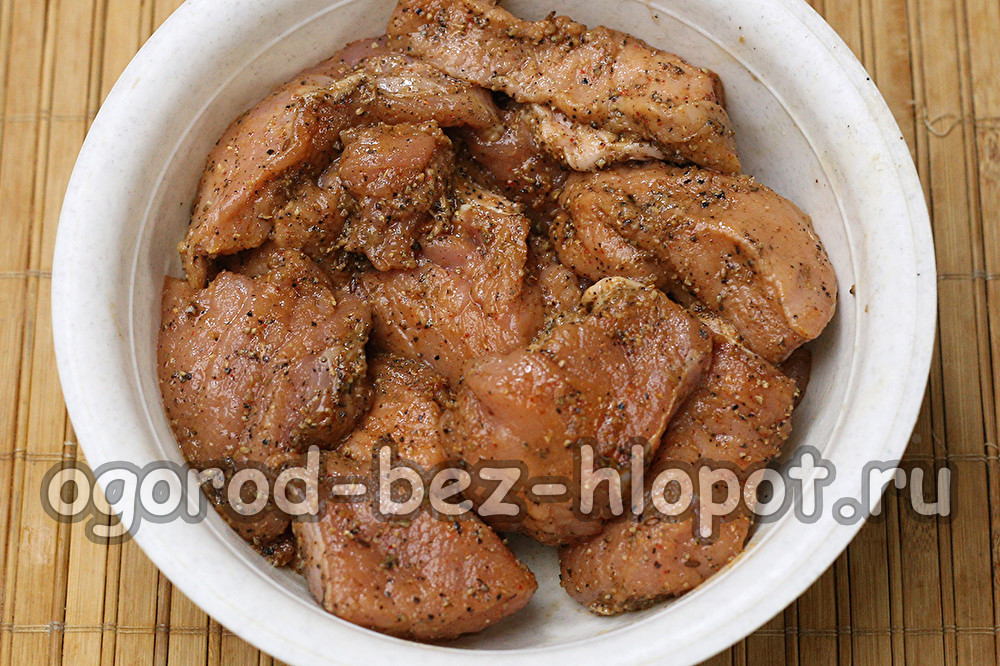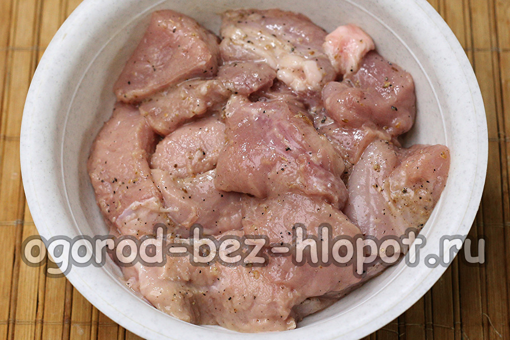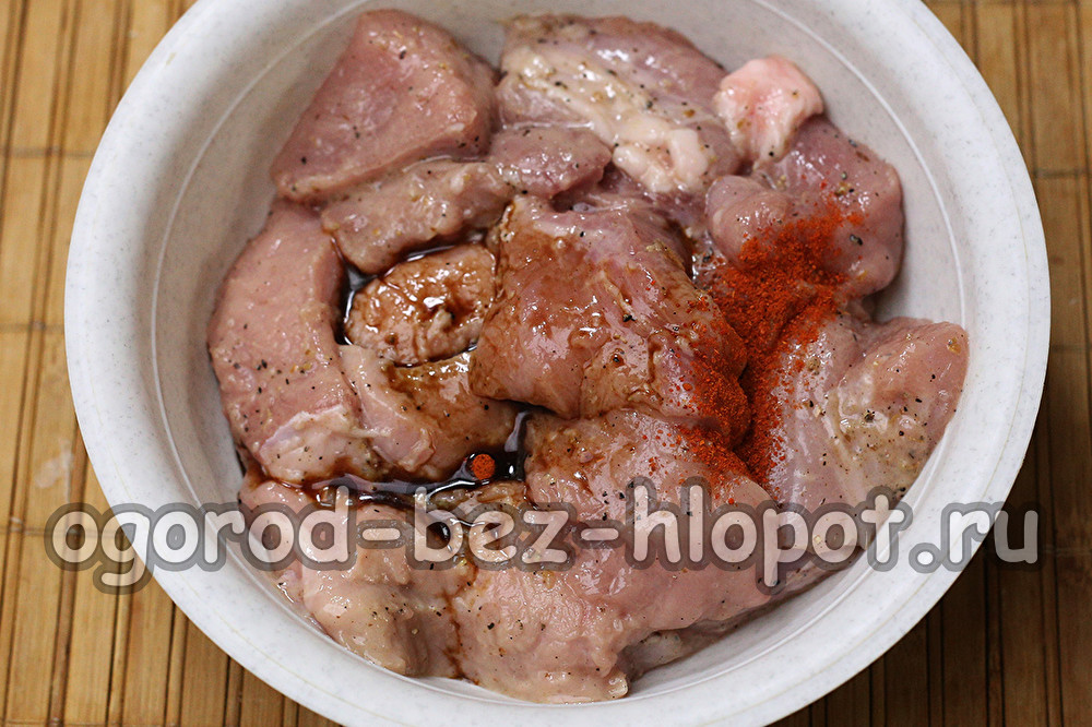 Нарязваме свинското на парчета, малко по-малки, отколкото за обикновените кебапчета. Добавете лимонов сок, майонеза, сол и смлян черен пипер.