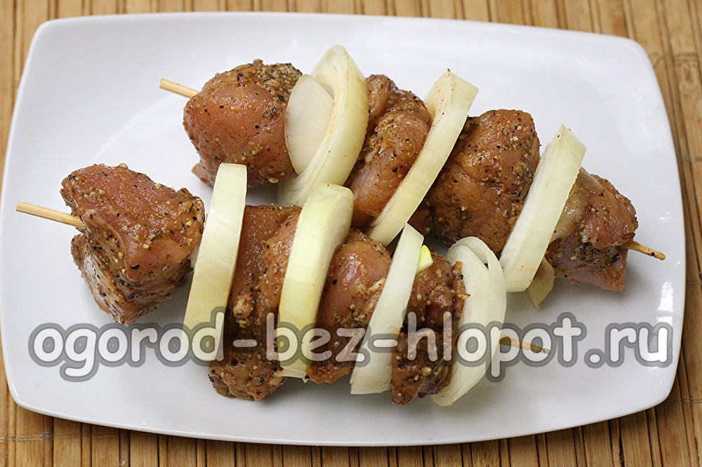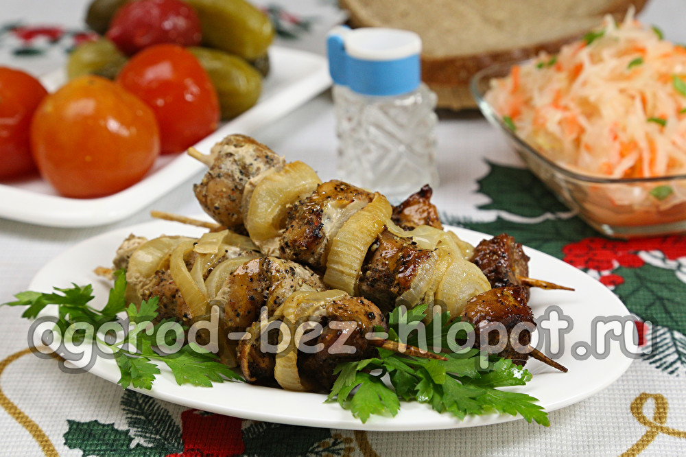Месо с кост .. ако е свинско .. тогава ребра без кожа .. много лук, нарязан на половин пръстени .. подправки и малко растително масло, за да се придържаме по-добре към месните подправки .. без сол !!! Няколко три часа .. в торба или в купа .. лукът се запържва отделно на скарата в тиган в олио .. месо на големи парчета на шишчета .. !!! На дървото !!! Без майонеза .. вино .. сок .. минерали .. кефир .. саламура .. и оцет !!!)