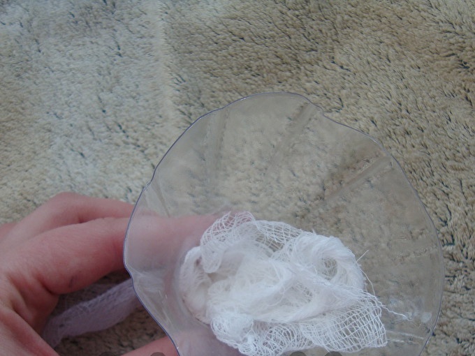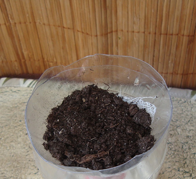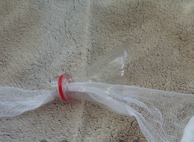 Прекарайте превръзка в гърлото на бутилката, тя ще виси надолу до дъното на втората част и ще играе ролята на дренаж, през който водата ще навлезе в земята.