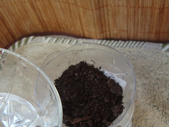 Изсипете половин чаша вода в системата, почвата трябва да бъде наситена с влага за известно време. Налейте вода в дъното на системата до нивото на шията. Благодарение на поставената превръзка на марля водата ще потече в земята и допълнително подхранва корените на разсад.