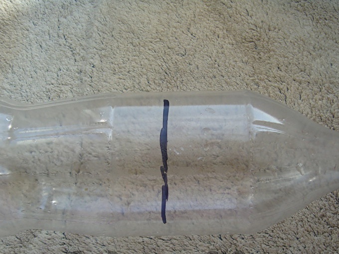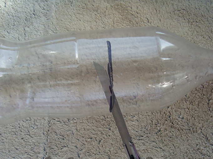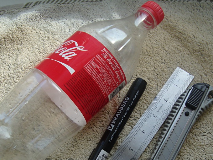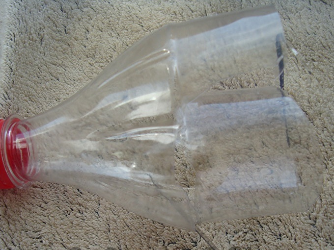Първата стъпка е да отрежете част от бутилката от дъното. По-добре е да отрежете около 2/3 от бутилката, в бъдеще, ако палетът е дълбок, той може да бъде намален, но увеличаването на височината ще бъде доста проблематично и работата ще трябва да се пренареди.