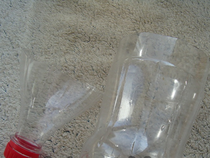 Ако използвате малка бутилка, отрежете гърлото на мястото, където тя се разширява максимално. Ако диаметърът на отрязаната част на гърлото е по-малък от диаметъра на тигана, системата няма да работи, горната част просто ще падне в долната част.