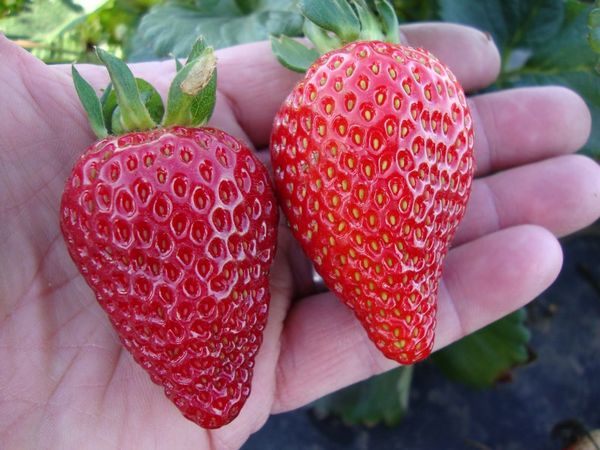 Що се отнася до самите сладки плодове, то в този сорт те също са доста големи. По-специално, теглото достига около 40 грама, често достига 50 грама. При суша и интензивна топлина плодовете стават по-малки, но не изчезват изобщо. Снимката показва, че тази ягода има удължена конусовидна форма, наситен алено-цвят. Месото на плода е гъсто, ароматно и много сочно.