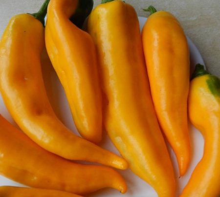Сортът получи името си заради цвета на плодовете: първите плодове имат ярко жълт цвят. Когато напълно узрее, плодът получава червено-оранжев оттенък. Растението достига височина от 70 сантиметра, което го прави средно голям сорт. Имайки формата на банан, чушките достигат 20 см дължина. Дебелината на стената достига 8 мм, а теглото на плода е средно 250 грама. От един квадратен метър можете да съберете до 5 кг плодове.