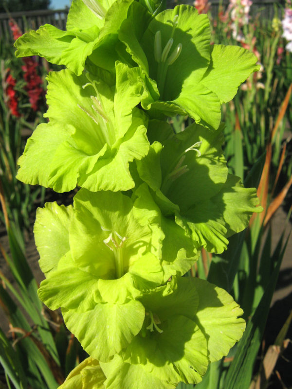 Поради това те цъфтят и преди. Джуджетата гладиоли не се нуждаят от жартиера. Ако високите представители се комбинират само помежду си, тогава границата идеално се вписва в различни цветни аранжировки. Комбинирайки високи и ниски степени, можете да получите цветове за фойерверки.