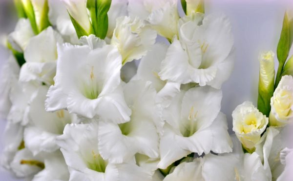 - Бял гладиол. Те са напълно бели и с разнообразни импрегнации, пъстри. Най-популярните сортове са московски бял камък, бяла бреза, Асол, планинска пепел в снега. Още от имената става ясно, че разновидностите на руската селекция. Първите две имена са чисто бели цветя с мощни, плътни, силно гофрирани съцветия. Следните две разновидности са чудесни за рязане. На снежнобялите венчелистчета имат тъмночервени петна.