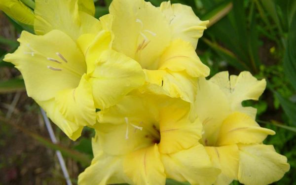 - Жълтите и кремавите сортове се отличават от останалите по високата си генетична устойчивост към болести. Акцентът е ярък слънчев жълт цвят с малинов език в средата. Златната антилопа е пищно златисто цвете със силно велпапе. Ново разнообразие от зашеметяваща красота. Гладиолус половските танци са отлично разнообразие за рязане. Комбинацията от лимонови и медни цветове създава усещането за трептящи пеперуди. Ранният сорт Krasava впечатлява с нюанси на жълто, розово и зелено.