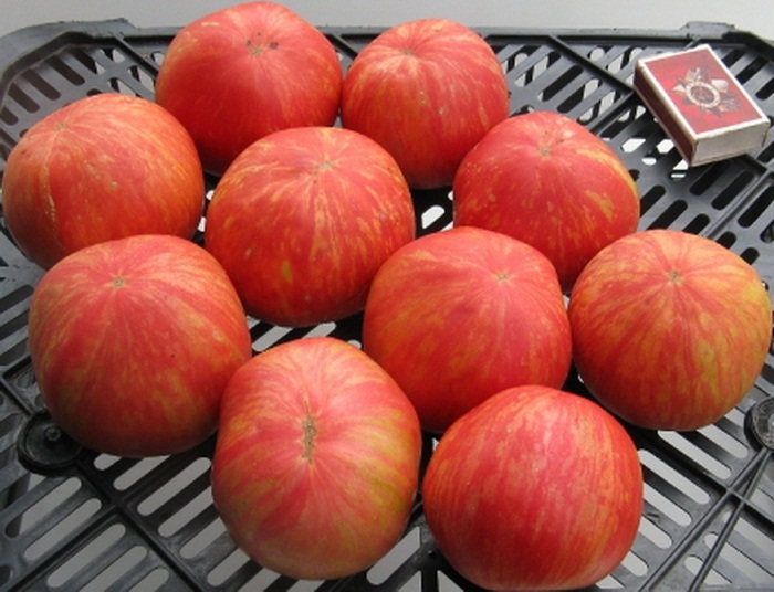 Плодовете са сърдечно-овални с малък заоблен нос, сладки, има лека киселина и богат домат аромат. Средното тегло на доматите е 50–70 грама. Кожата е гъста, плътта е червено-розово сочна, леко сладка. Има не повече от 4 камери за семена, малко семена. Цветът на домата е пъстър, основният цвят е червен. Неравномерните жълти и оранжеви щрихи се простират от стъблото и се разпространяват в целия домат.