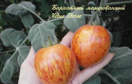 Искам също да отбележа, че Velvet Streaked е доста рядък, колекционерски домат, той рядко се среща в магазините и каталозите. Обаче, закупили заветните семена, в бъдеще те могат да бъдат събрани независимо. Семената се отличават със забележително покълване, а потомството, което дават, запазва всички сортови характери на оригиналното растение.